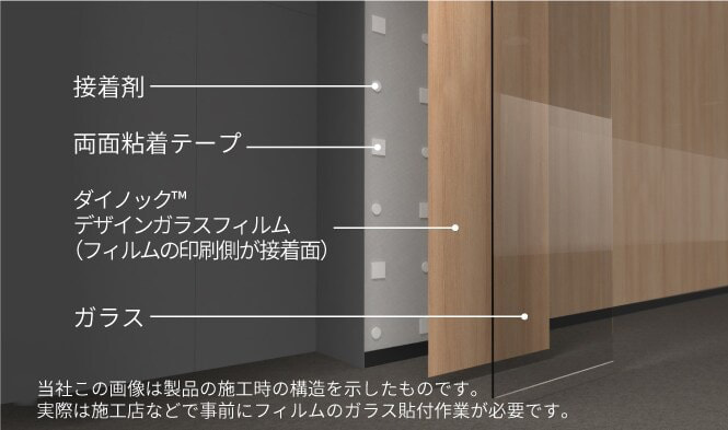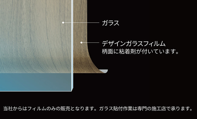 多彩なデザインと高い意匠性を誇る3M™ダイノック™フィルムをガラスの裏面に貼付し、ガラス越しに高級感や立体感を表現できる、ガラス用化粧塩ビフィルムです。化粧塩ビフィルムの柄面(印刷面)に粘着材があり、透明の剥離紙を剥がしてガラスに貼付することで、3M™ダイノック™フィルムの美しいデザインガラスが完成します。