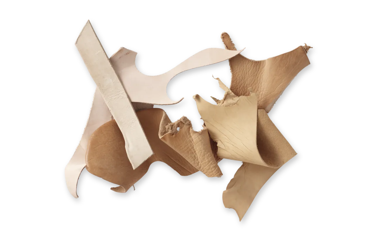 捨てられていた大量の端材を、粉砕し再形成することで、リサイクルレザーとして生まれ変わりました。独自の風合いと特性により、リアルレザーではできなかった新しい表現を可能にします。