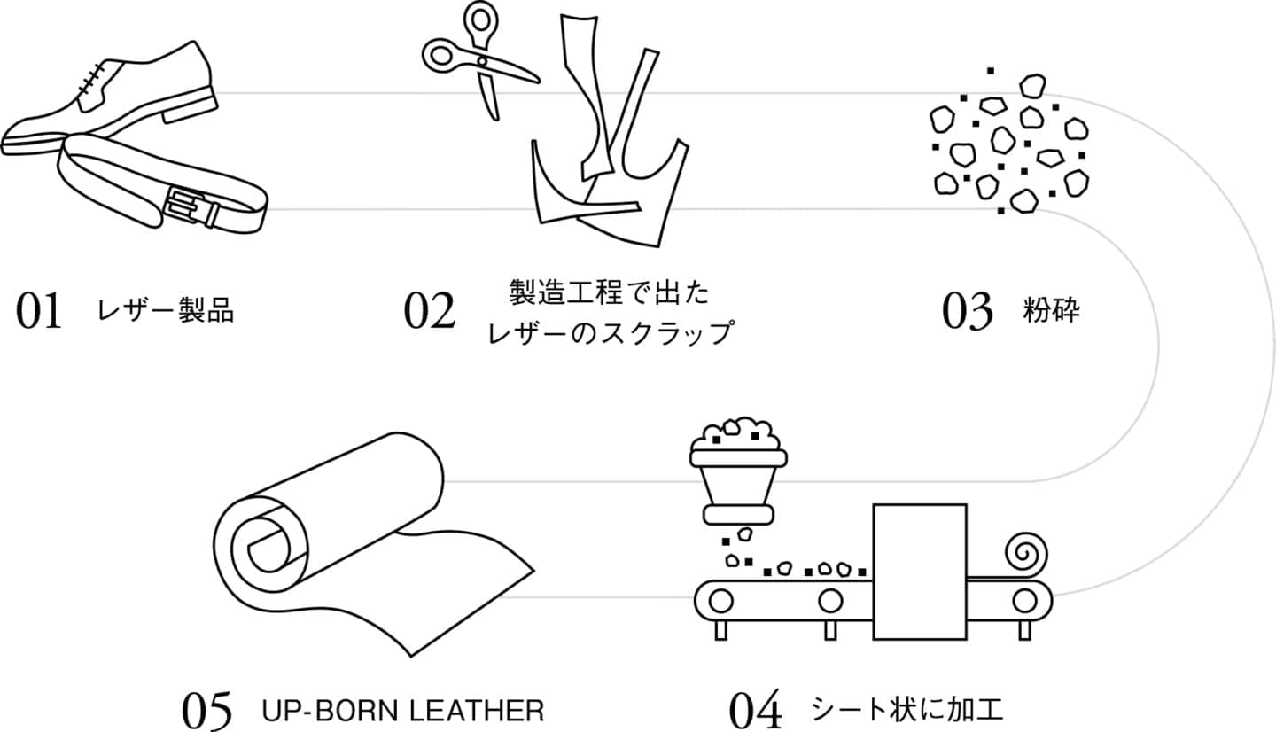レザー製品の端材を工場へと移動させ、ファイバー状になるまで粉砕します。そのファイバーを調合してシート状に加工することで、アップボーンレザーが生まれます。